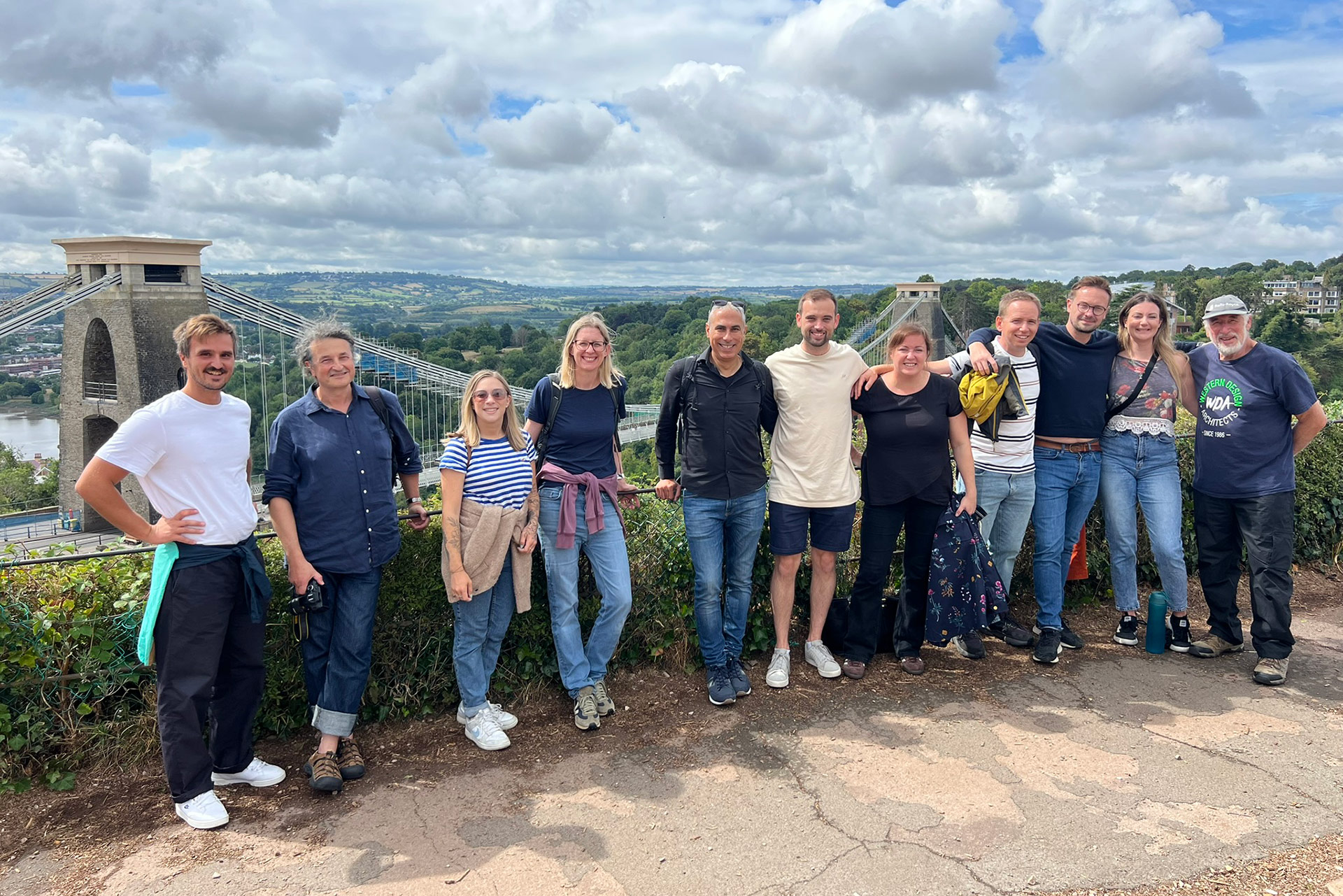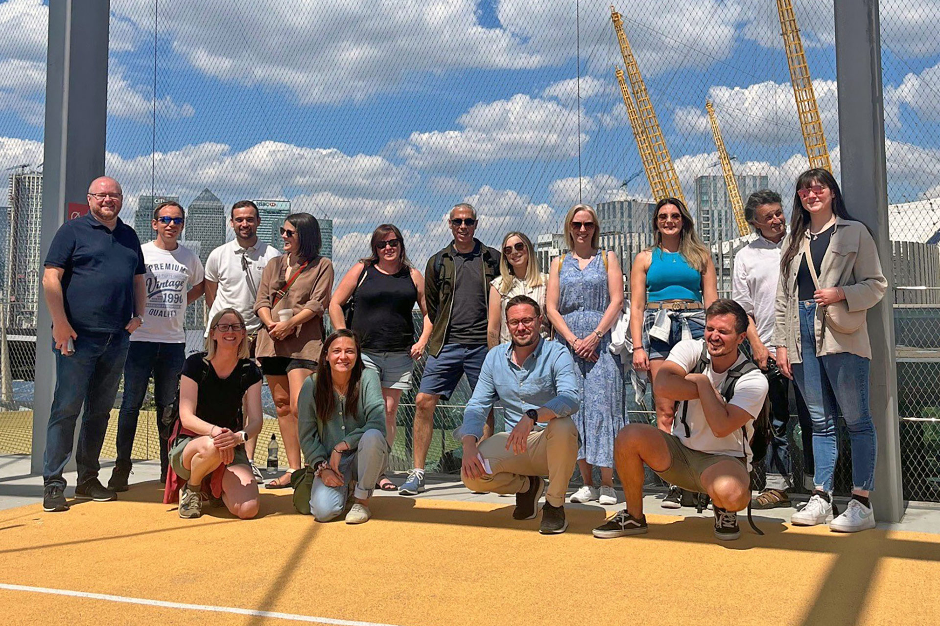 woman sat down and men standing leaning on desk looking at computergroup of staff members standing on pontoon in front of sailing boatsWeymouth Civic society awards at Northe FortSix women standing against and stone and brick wall