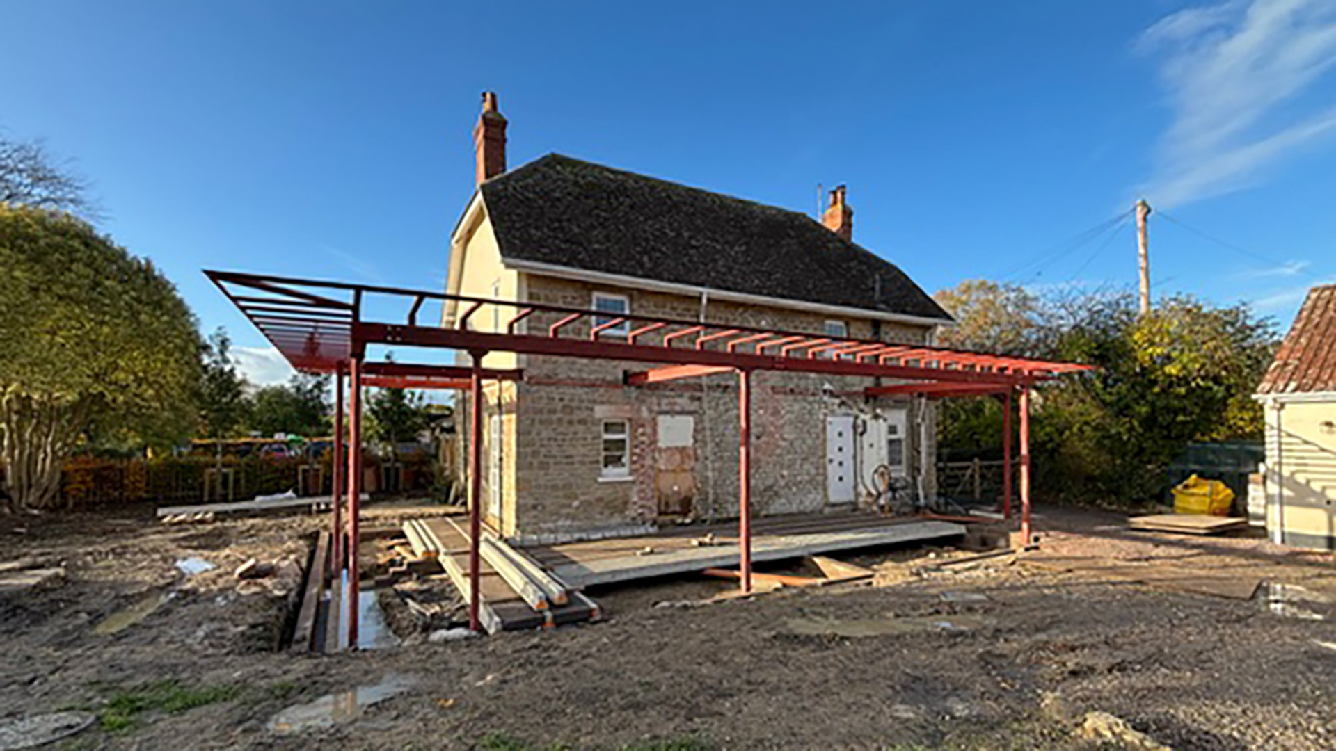 Our modern extension to this beautiful historic home near Sherborne, Dorset is taking shape. The steel frame is up, and we’re thrilled to see the design come to life — especially the super-slim roof edge detail developed working with Vincent Design Engineering.