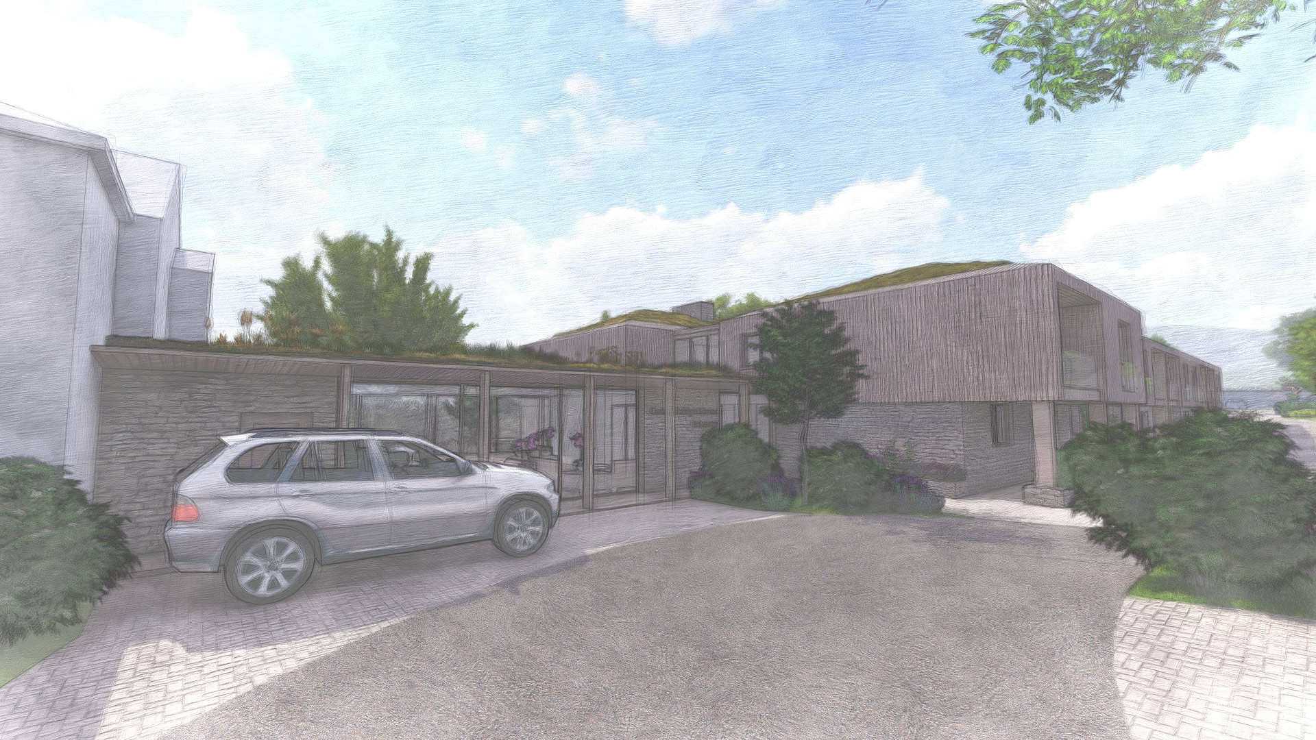 Subservient in scale to the listed building, the new wing will be finished with natural Purbeck stone at ground floor and natural timber cladding at first floor. A bio-diverse extensive green roof will provide a low maintenance finish to the shallow pitched roof to help blend the building into the landscape. This will also be planted with a range of drought tolerant wildflower plants.