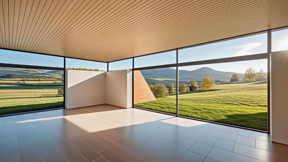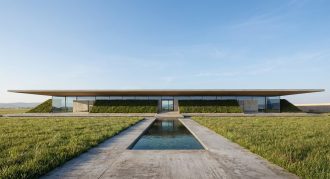 The building is nestled within a surrounding earth berm minimising it’s visual impact in the landscape whilst reflecting the historical burial mounds. The roof gives the appearance it is floating, facilitated through high level clerestory glazing allowing light to flood into key areas. The building and landscaping build on the character of the landscape and use a palette of grass, water, stone, timber and brick.