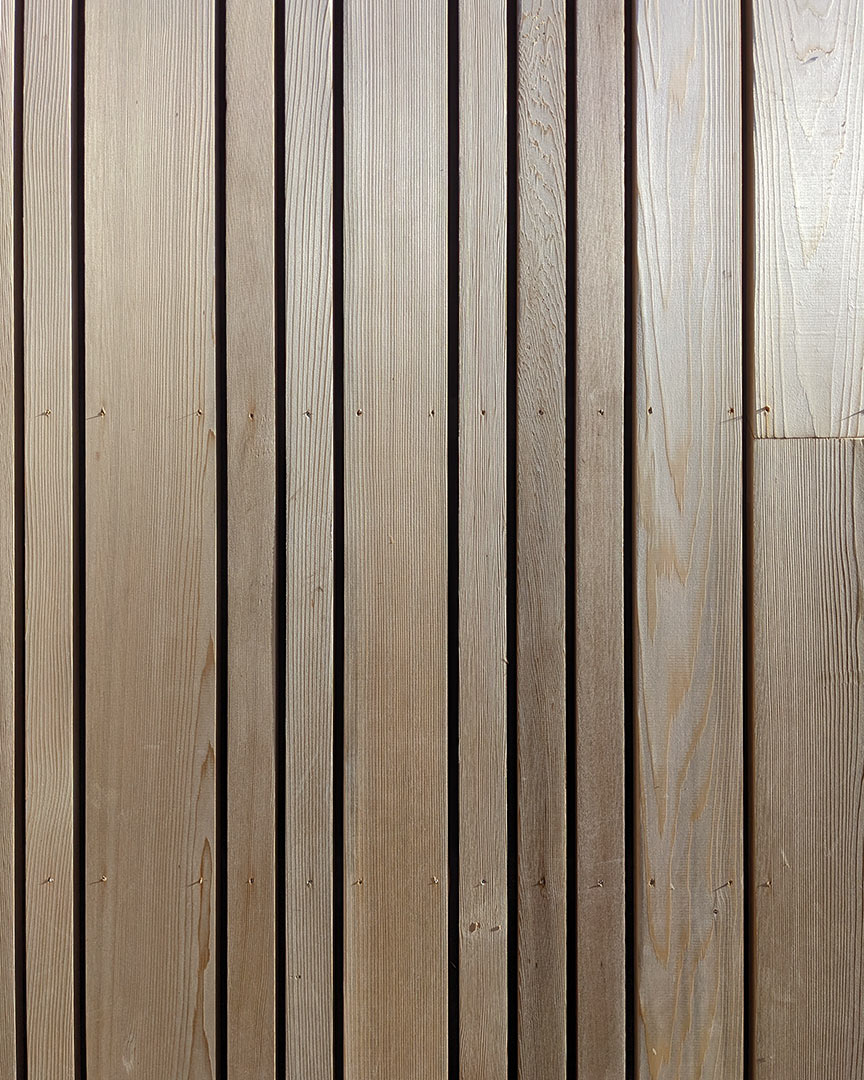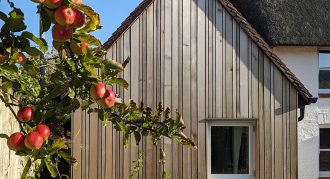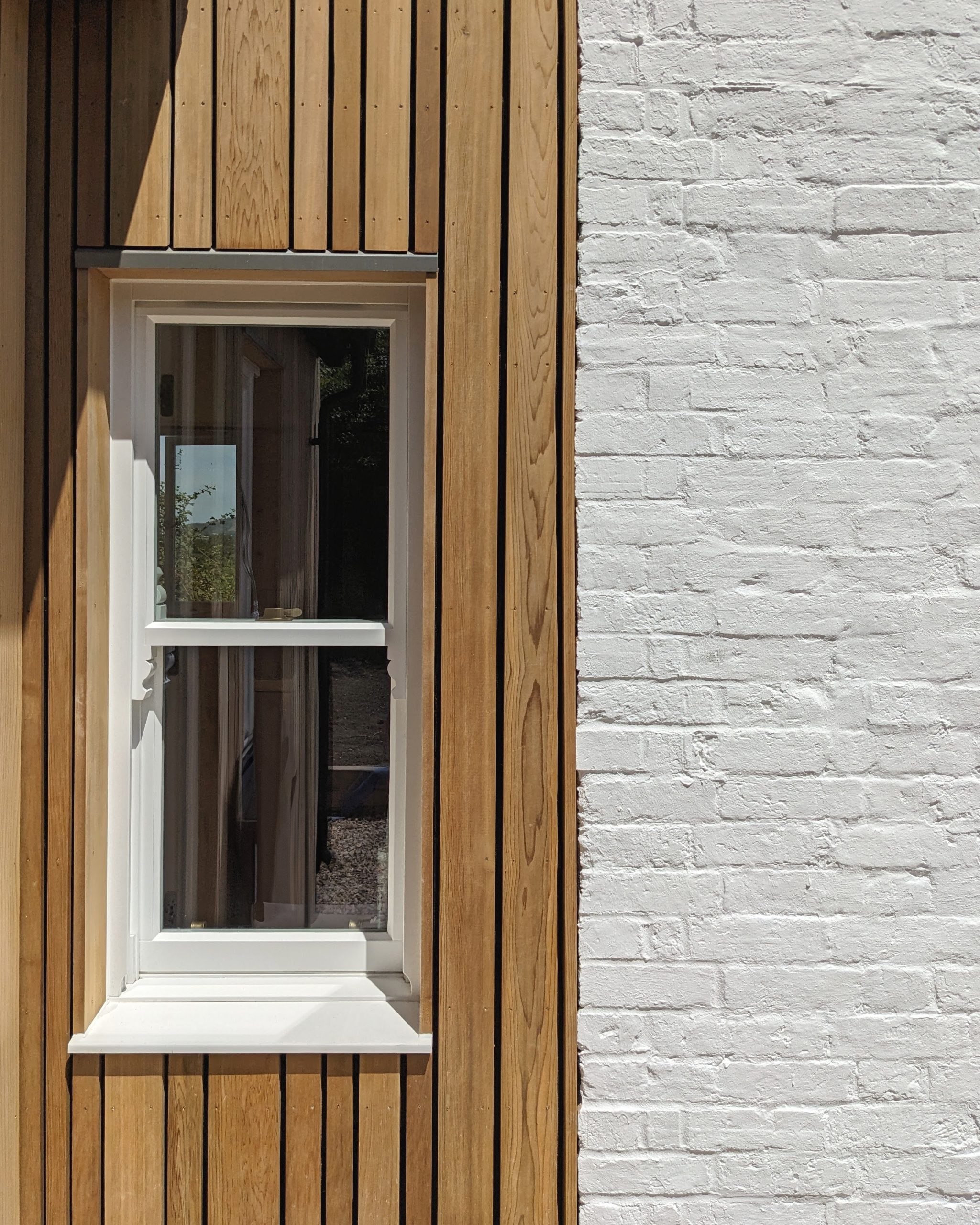 Materials were chosen for their quality, texture, and compatibility with the existing cottage. The vertical western red cedar cladding, in varied widths, will naturally weather to an attractive silver-grey over time. The replacement porch is built from local, handmade Swanage red bricks, with an oak post supporting an overhanging log store on one side and an integrated oak bench on the other.