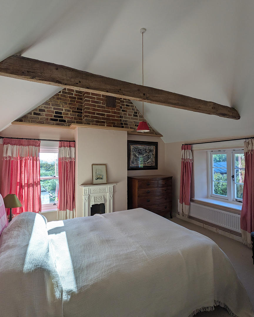 A failing timber beam in the living room was replaced with a new steel beam within the floor, and a new window was introduced to the east gable at first floor, offering views of the orchard and bringing morning sunlight into the main bedroom. The cottage also benefited from a full rewire, with new light fittings and power sockets throughout.