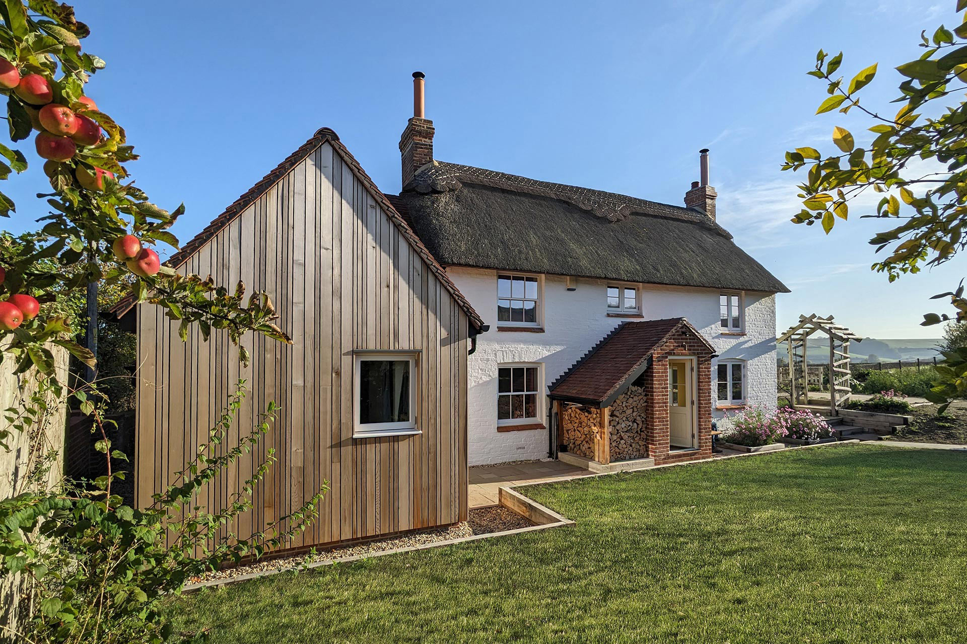 The new additions and modern upgrades to the thatched cottage transform a once cold and cramped holiday home into a delightful welcoming country retreat.